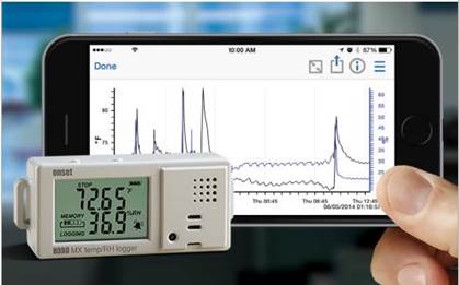 使用手机或平板电脑等移动设备(IOS和Android设备)安装Onset的免费HOBOmobile APP(可在APP Store和Google play下载),就可以对30m(实际使用距离会受设备功率和障碍物影响)范围内任何一个MX1101无线温湿度记录仪进行管理设置,从而获取数据,数据能够以图形方式显示,同时也可以检查记录运行状态、配置警报通知,并共享数据文件。